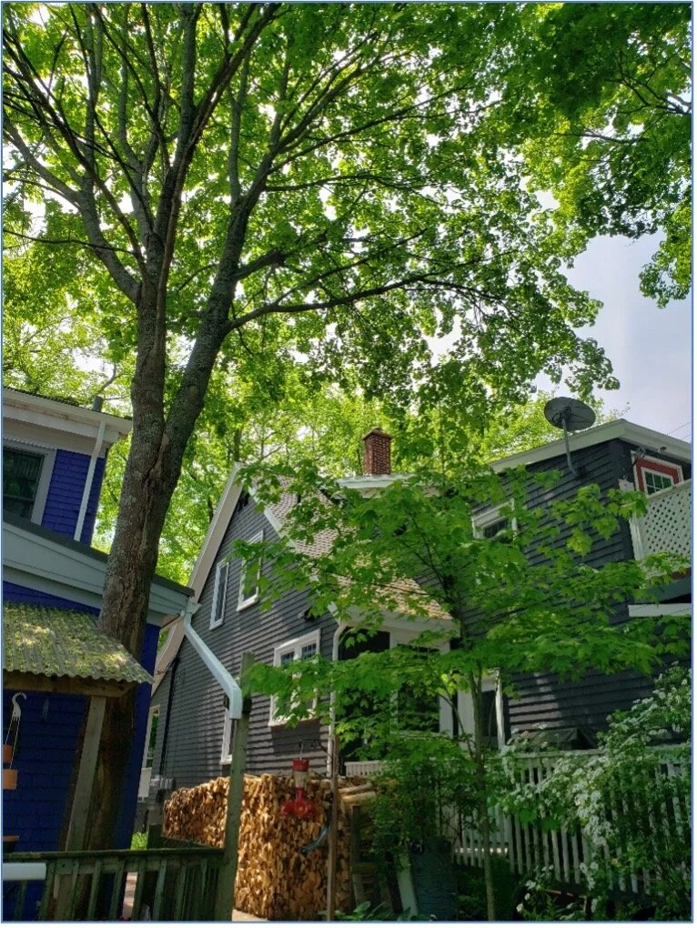 In Halifax, some nuisance shade is the unwanted gift of one tree species planted extensively as a street tree and whose seedlings have populated many private yards. We met the Norway maple in a previous article in the urban forest series (Duinker, 2020). Norway maples leaf out earlier than most other tree species, grow rapidly, and form a dense canopy. The heavy shade they cast inhibits vigorous growth of other young tree species and vegetation. Compare the dense canopy of the Norway maple in the left of the first photo to the high, open canopy of the large red oak on the right. The red oak allows some sunlight to pass through, permitting plants at lower heights to thrive. Managing growth by frequent trimming will help to reduce the shade cast by the opportunistic Norway maples. Fortunately, Norway maples are declining in number in Halifax, as they are vulnerable to strong winds and often die young. In the other photo, a Halifax homeowner is planning to remove the large Norway maple to improve growing conditions – including sunlight – for the sugar maple planted beneath.
